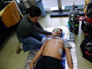 | 内 容 | レクチャー 約3時間 病気やケガなどの知識の勉強。 実技 約2時間 人形や人での実際の心臓マッサージや人工呼吸、 AED(電気ショック)練習など |